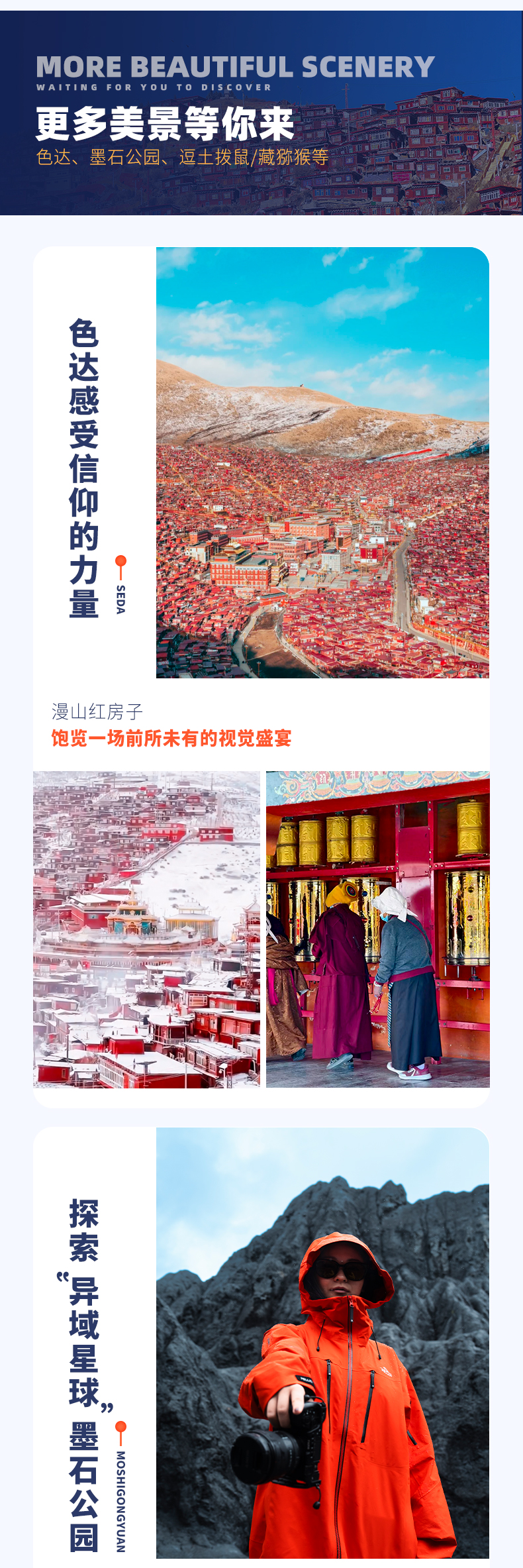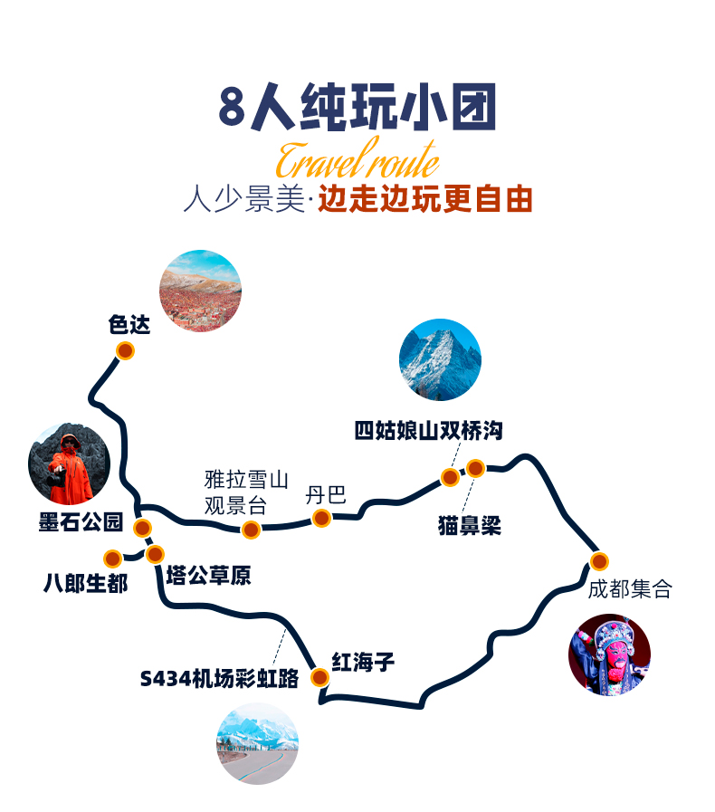 4、景交:四姑娘山双桥沟观光车70元/人(必须);墨石公园观光车20元/人(必须);红海子清洁费30元/人(可选);八郎生都清洁费30元/人(必须);色达乘车票48元/人,报名后请根据自己的游玩日期自行预约;